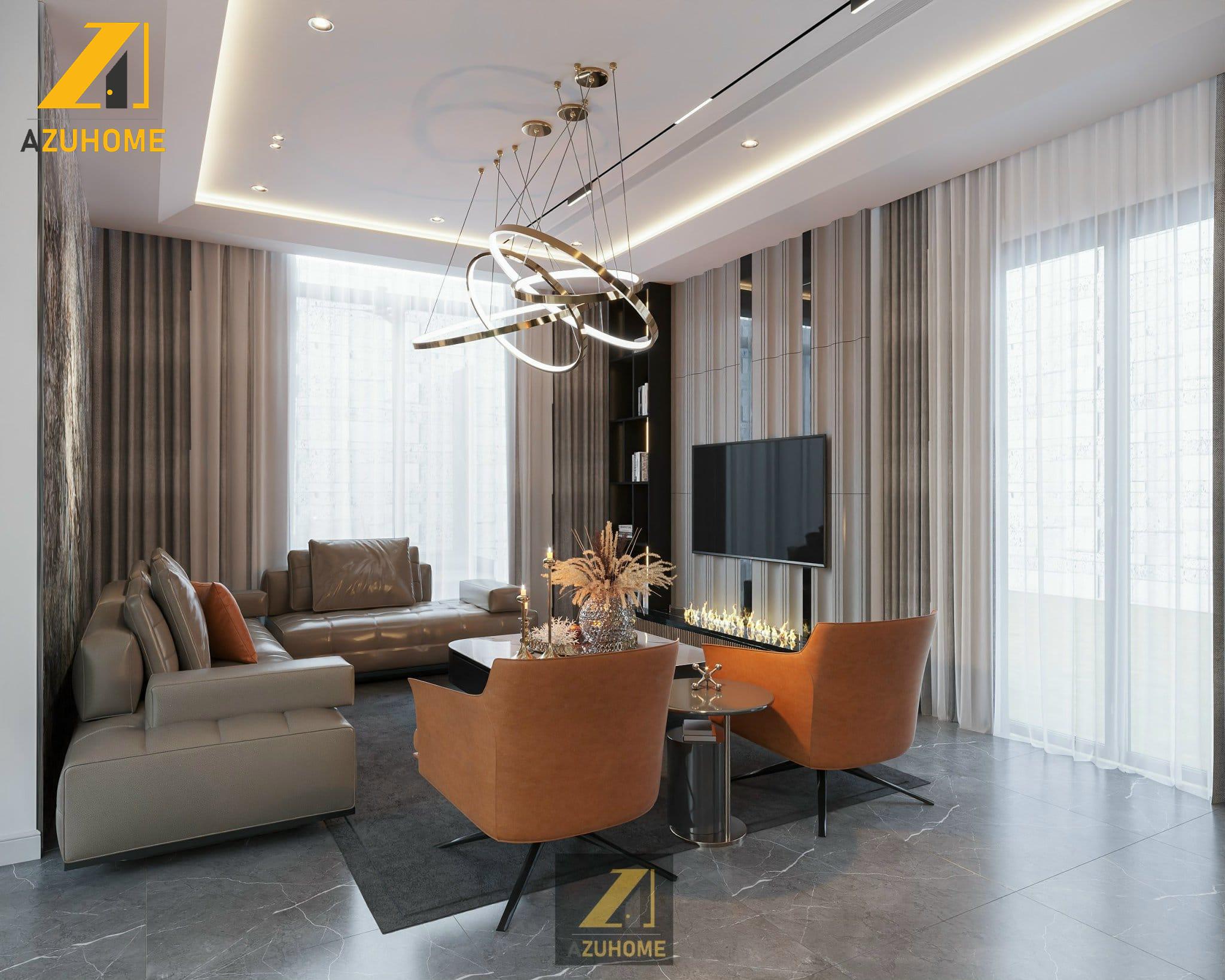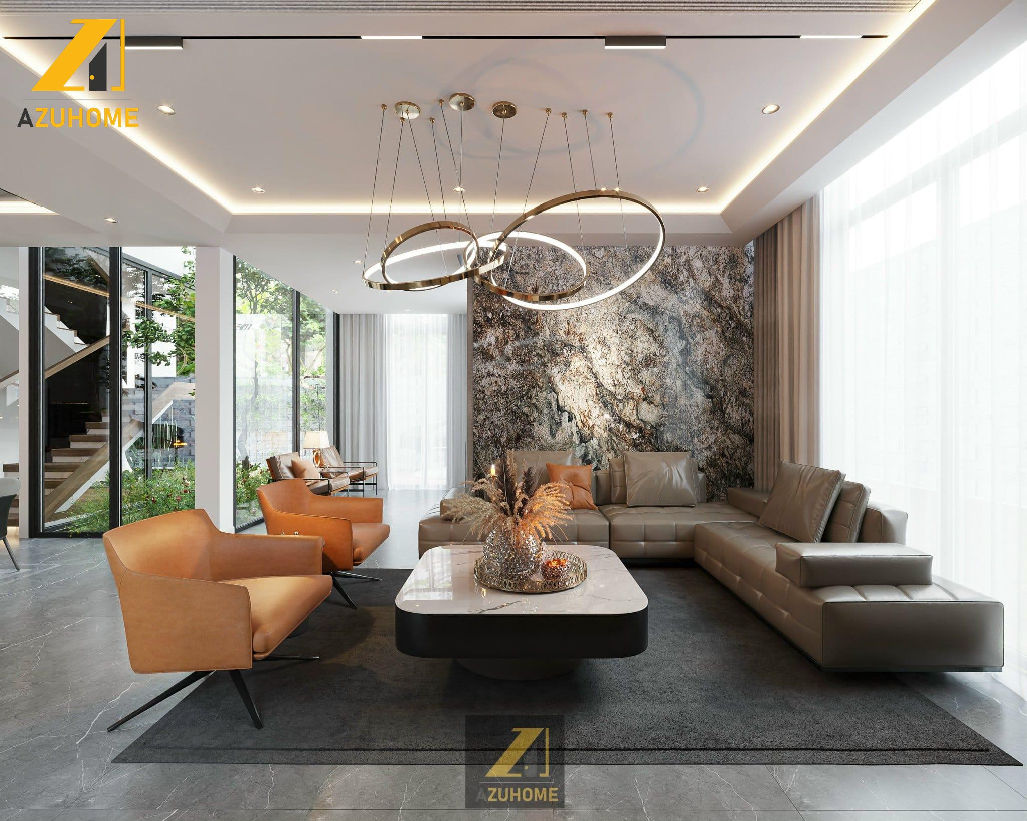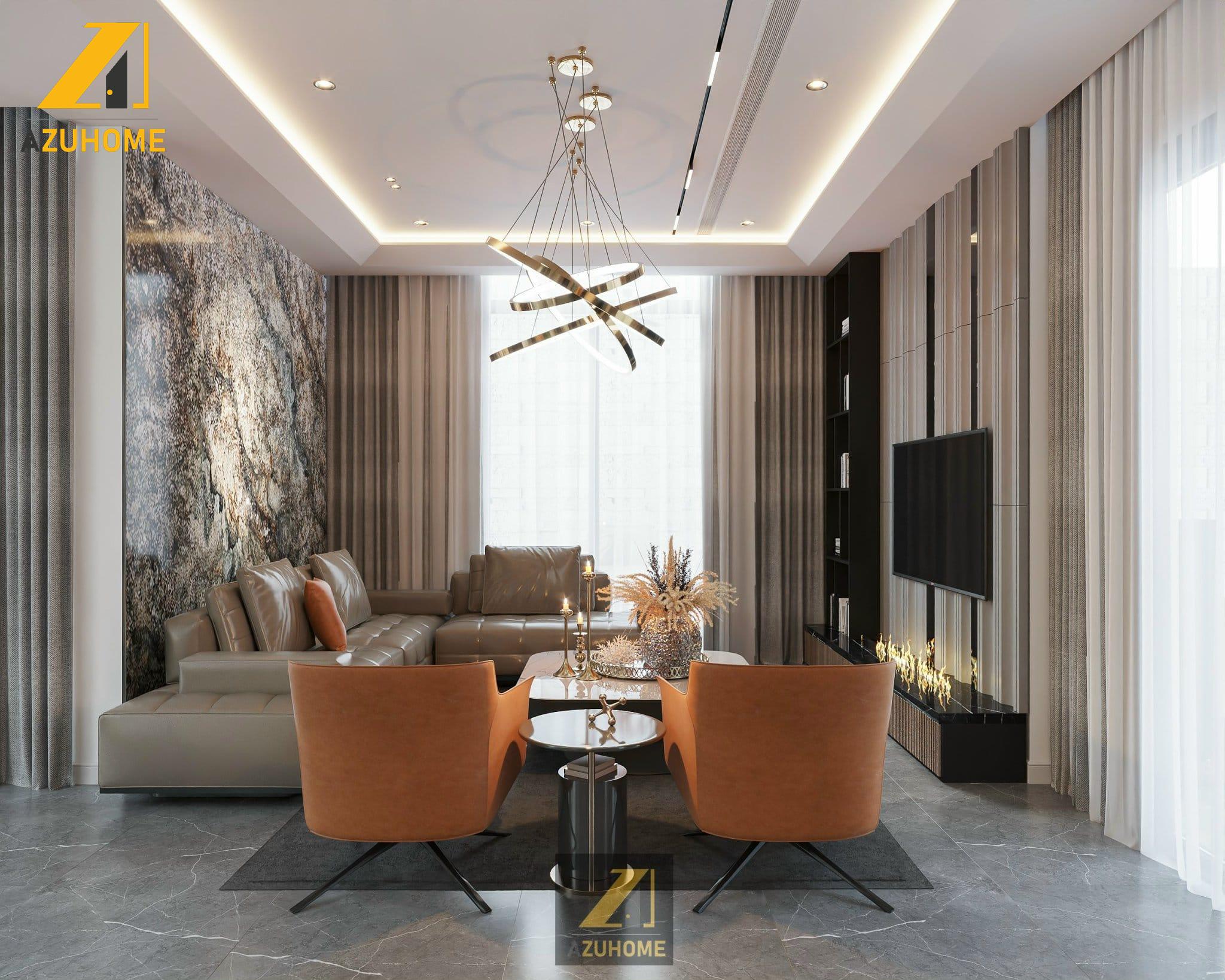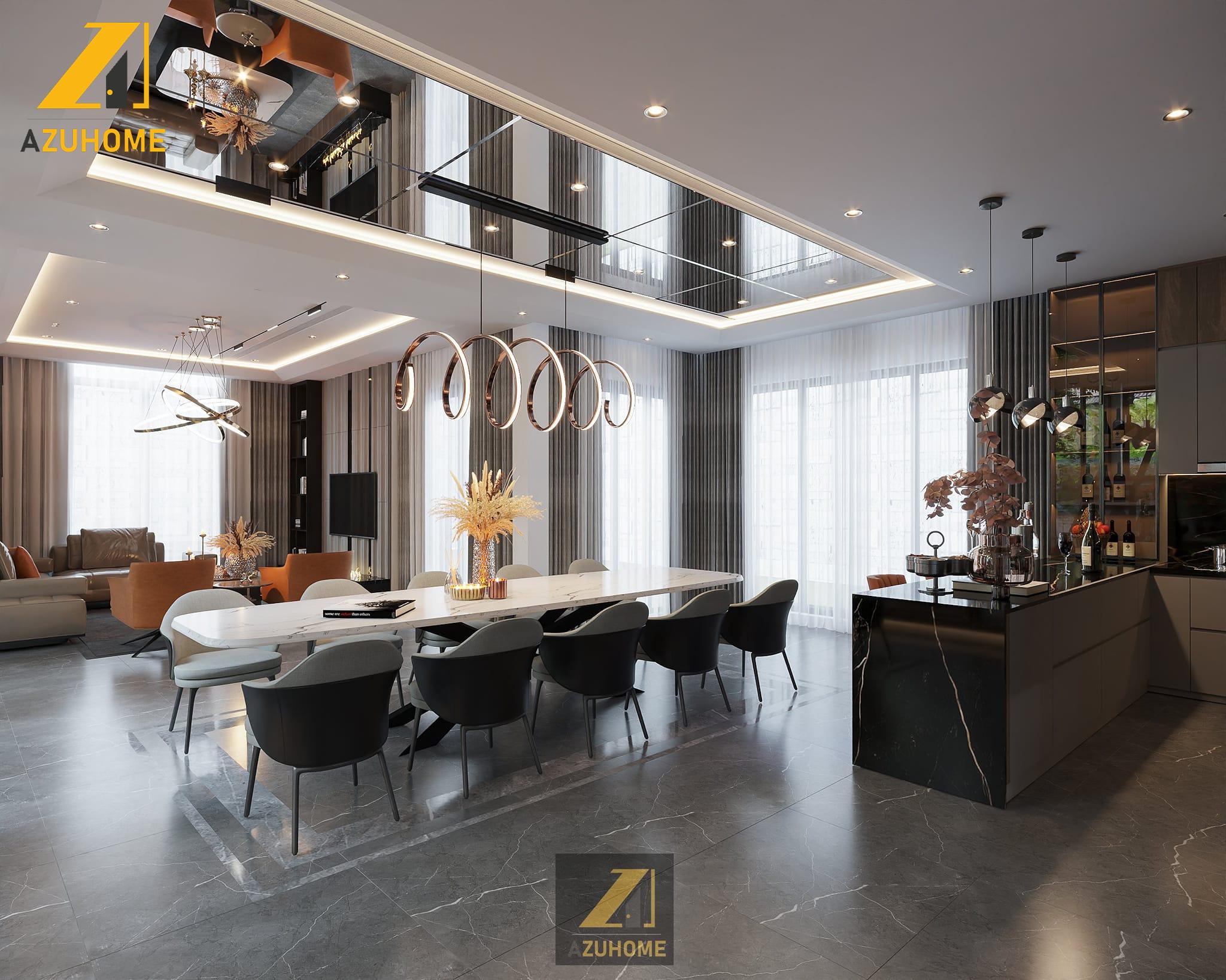 Đặc biệt nổi bật là hệ thống đèn trùm mang đến sự xa hoa bậc nhất. Có thể thấy những tone màu vàng – be – nâu được các kiến trúc sư tại Azuhome sử dụng một cách triệt để.